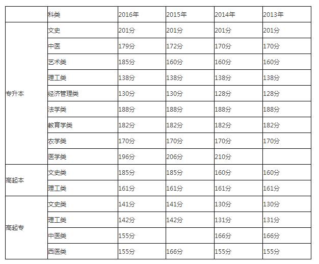 1、專升本:文史中醫類:201分;藝術類:185分;理工類:138分;經濟管理類:130分;法學類:188分;教育學類:182分;農學類:170分;醫學類:196分;