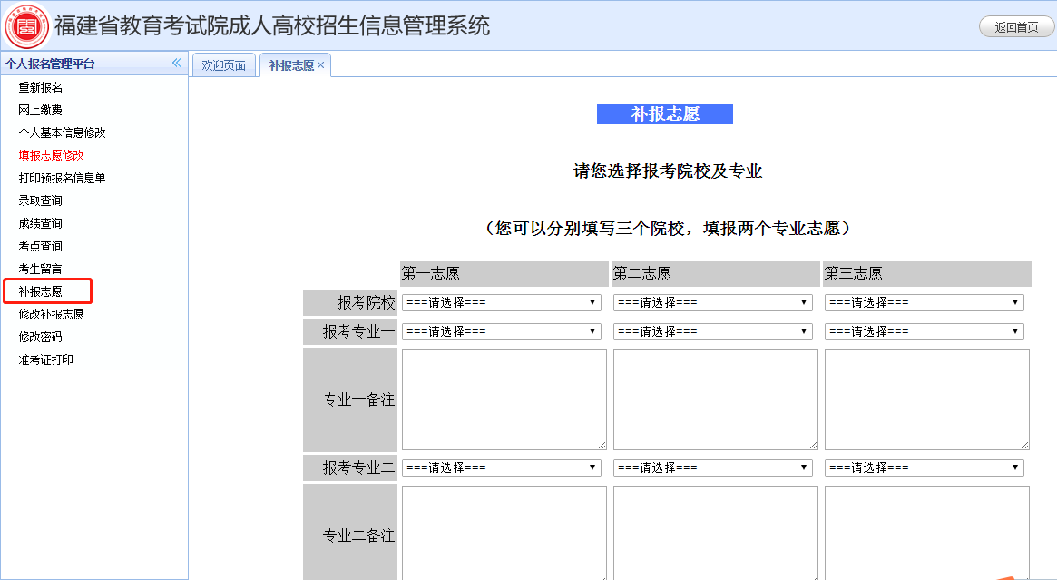 志愿補報地址:http://www.guangquan.net/cjcx (此地址也可以查詢錄取結果),點擊進入,使用用戶名和密碼登陸,點擊左側“補報志愿”。