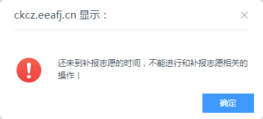 各位考生登陸進(jìn)福建成人高考考生信息管理系統(tǒng)之后,若想修改志愿,系統(tǒng)就會(huì)給出這樣的提示(如下圖),所以只能在規(guī)定的時(shí)間內(nèi)進(jìn)行志愿的補(bǔ)報(bào),時(shí)間為:11月28日9:00-11月30日18:00