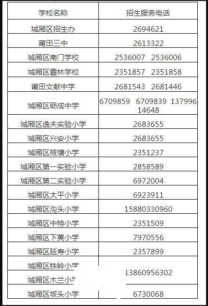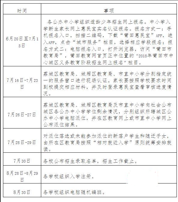 莆田城廂區2018年秋季中心城區義務教育階段學校招生工作方案